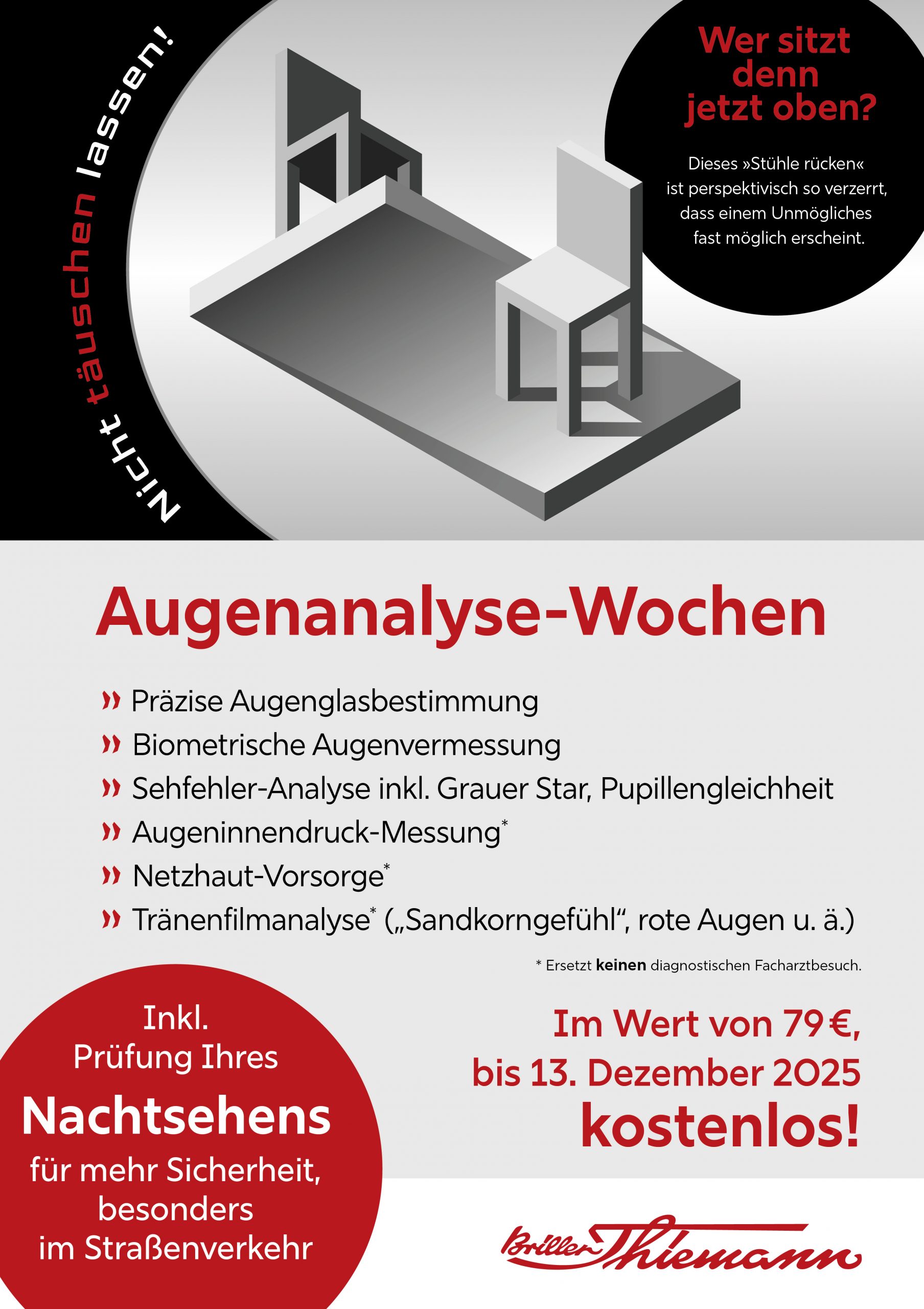 Brillen Thiemann kann als Optikerfachgeschäft stolz auf eine lange Tradition zurückblicken. Seit 1928 engagieren sich in unserem Unternehmen Optikermeister und hoch qualifizierte Angestellte für besseres Sehen und attraktives Aussehen. Wir empfangen unsere Kundschaft im persönlichen Ambiente eines modernen Familienunternehmens. Seit 1928 sind wir erst zufrieden, wenn Sie es auch sind – ein Anspruch, der uns jeden Tag motiviert.